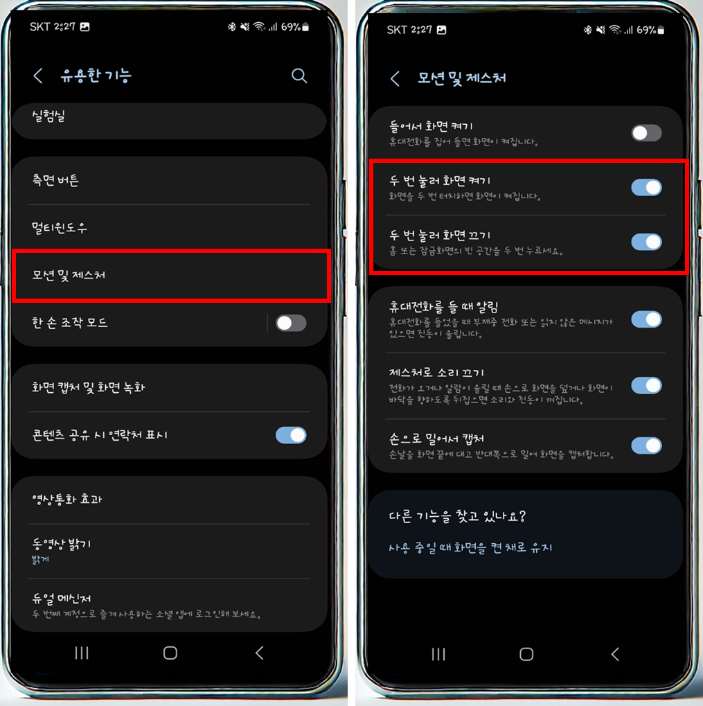 이렇게 설정을 마치면, 이제부터 화면이 꺼져 있을 때 디스플레이를 두 번 터치하면 화면이 켜지게 됩니다. 더불어, 동일한 메뉴에서 두 번 눌러 화면 끄기 기능도 활성화할 수 있습니다.